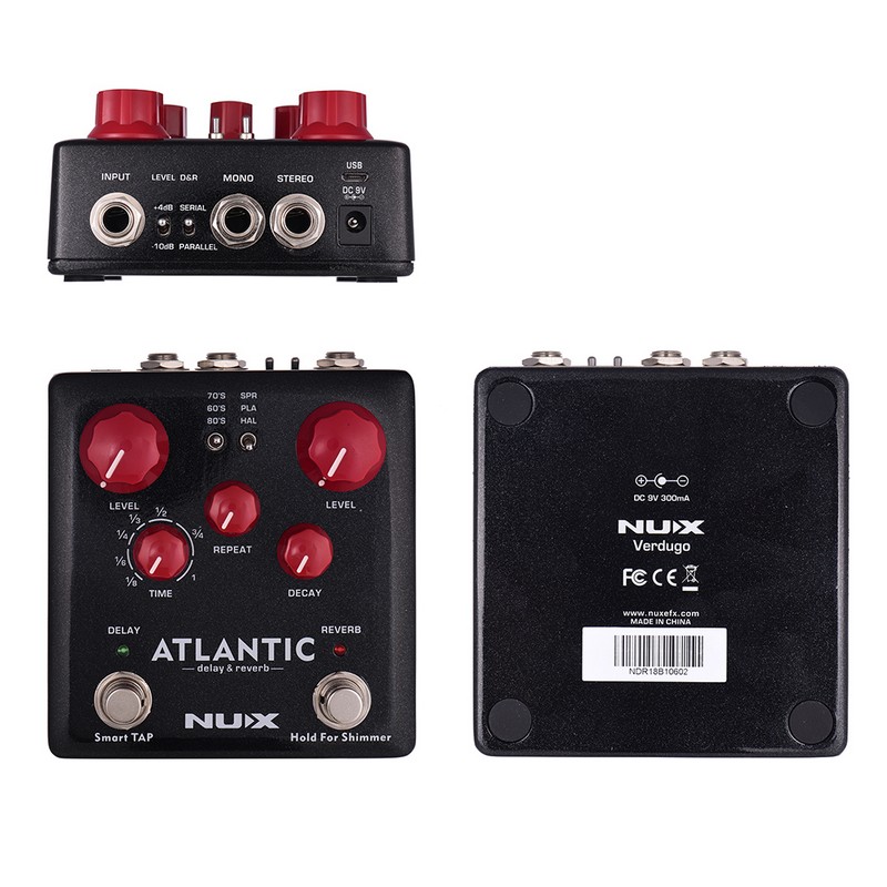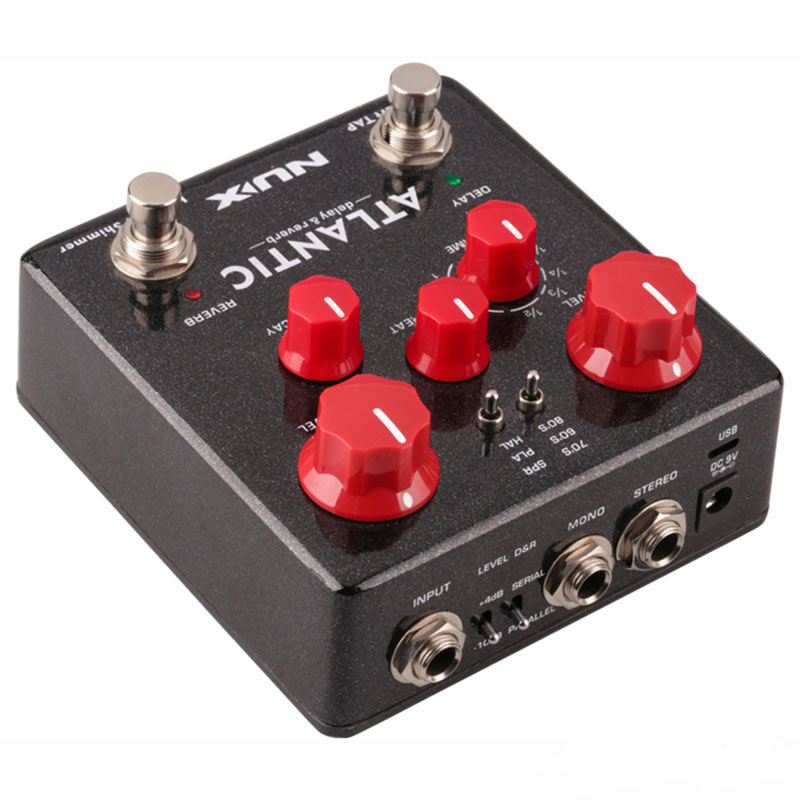 The NUX Atlantic pedal covers several Delay and Reverb types that are very representative in history: 60's Tape-Echo, 70's BBD Analog Delay, 80's Digital Delay, Spring Reverb, Plate Reverb and Hall Reverb. The latest algorithms with Core Image Technology from NUX offers you not only these classic effects, but also modern Shimmer and Freeze effects that inspire you to create dreamy musical ideas! Its patented Smart TAP function automatically understands if you want to turn on/off the delay or tap in the tempo.