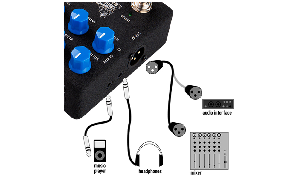 Adjusts to blend between the clean signal and overdrive signal. The clean signal remains as unity gain, allowing for fine control of the blend ration.