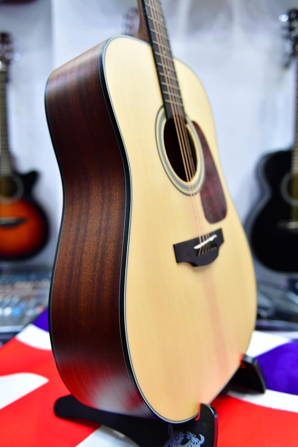 Other great features include a pin-less ovangkol bridge for easy string changes, synthetic bone nut and bridge saddle, ovangkol headcap, pearloid dot inlays, chrome die-cast tuners and an elegant Natural satin finish.