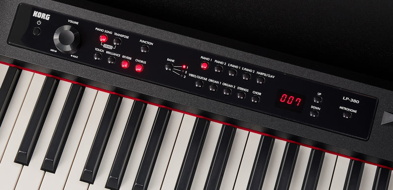 Controls: Power, Volume, Piano Song, Transpose, Function, Touch, Brilliance, Reverb, Chorus, Bank, Sound x 10, Up, Down, Metronome