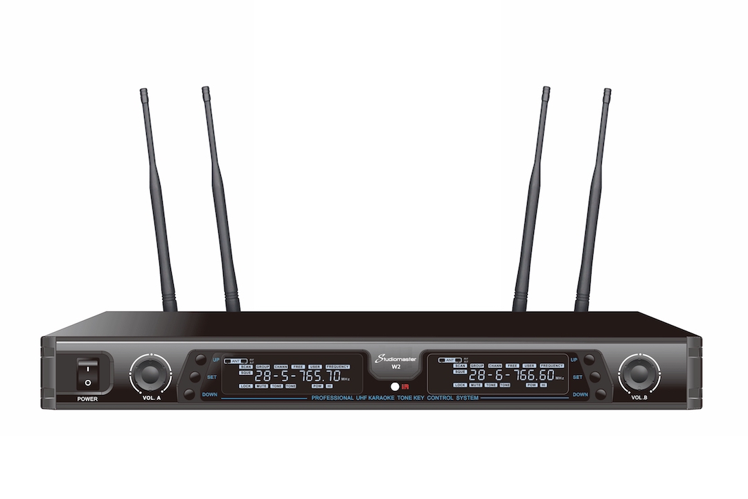 - Two channel handheld wireless microphones using UHF 600-999 MHz band