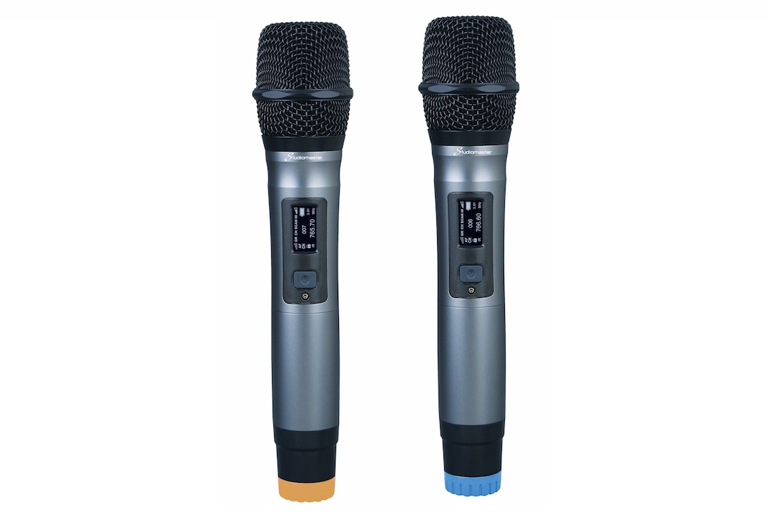 - Rechargeable handheld microphones with 80M range